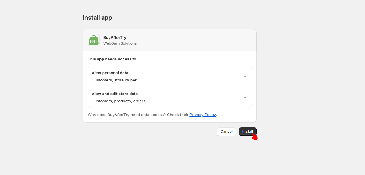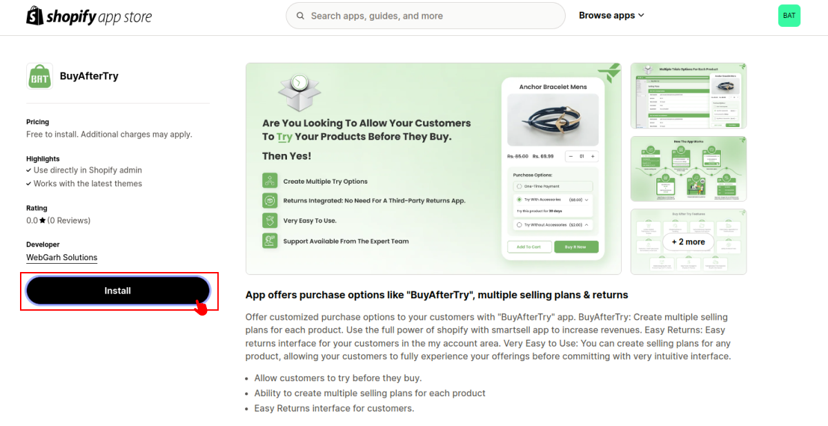 After setting up your selling plan, make it visible on your store's front page by adding the "BuyAfterTry" Button. Just go to theme customization, find the app block named "BuyAfterTry" Button and effortlessly place it anywhere on your product page. Customize your storefront with this button for a user-friendly and engaging shopping experience. Simple, right? Try it out!